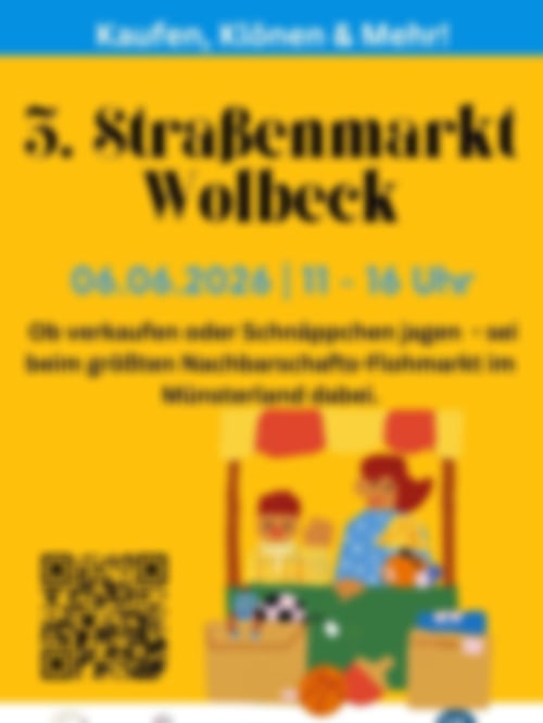 Wir sind uns sicher, dass wir wieder ein Event auf die Beine stellen können, von dem unser Stadtteil profitiert und uns als Bewohner:innen zusammenschweißt. Es sind alle Interessierten, die in Wolbeck sesshaft sind, eingeladen, auf ihrem Privatgrundstück einen Flohmarktstand herzurichten. Ob mit Decken, Malertischen, Bänken, etc. bleibt euch überlassen - ihr dürft gerne kreativ werden.